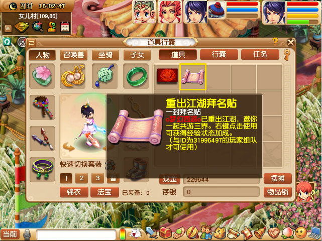 老玩家可给予道具“重出江湖-拜名贴”,广邀好友一起闯荡江湖,使用道具的好友将获得15%~20%的经验加成。