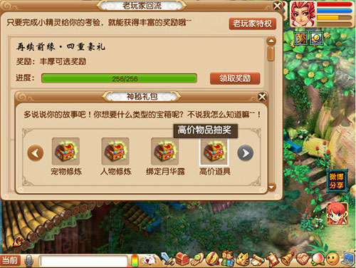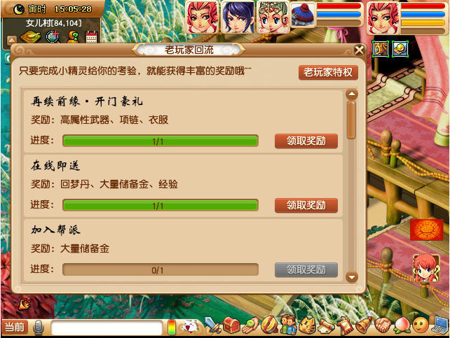 1)老玩家首次上线可获得道具“老玩家回流大礼包”,右键点击使用可领取奖励。
