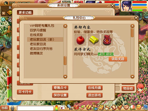 2)也可在”礼包中心“选择“老玩家回流(新)“,点击“领取奖励”弹出领奖界面。